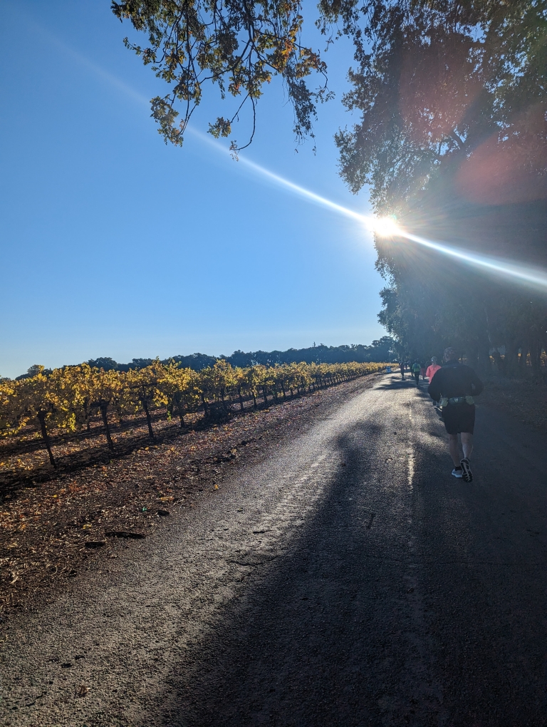 Right at 8 am we were off into the clear cold morning. As with most races the adrenaline was going and I definitely took off a bit quicker than I would have liked but it was also hard to slow myself as I didn’t feel like I was going that fast to begin with. The majority of the run took place on back country roads weaving through both vineyards as well as other farmland. A short part of it was also along a levee.