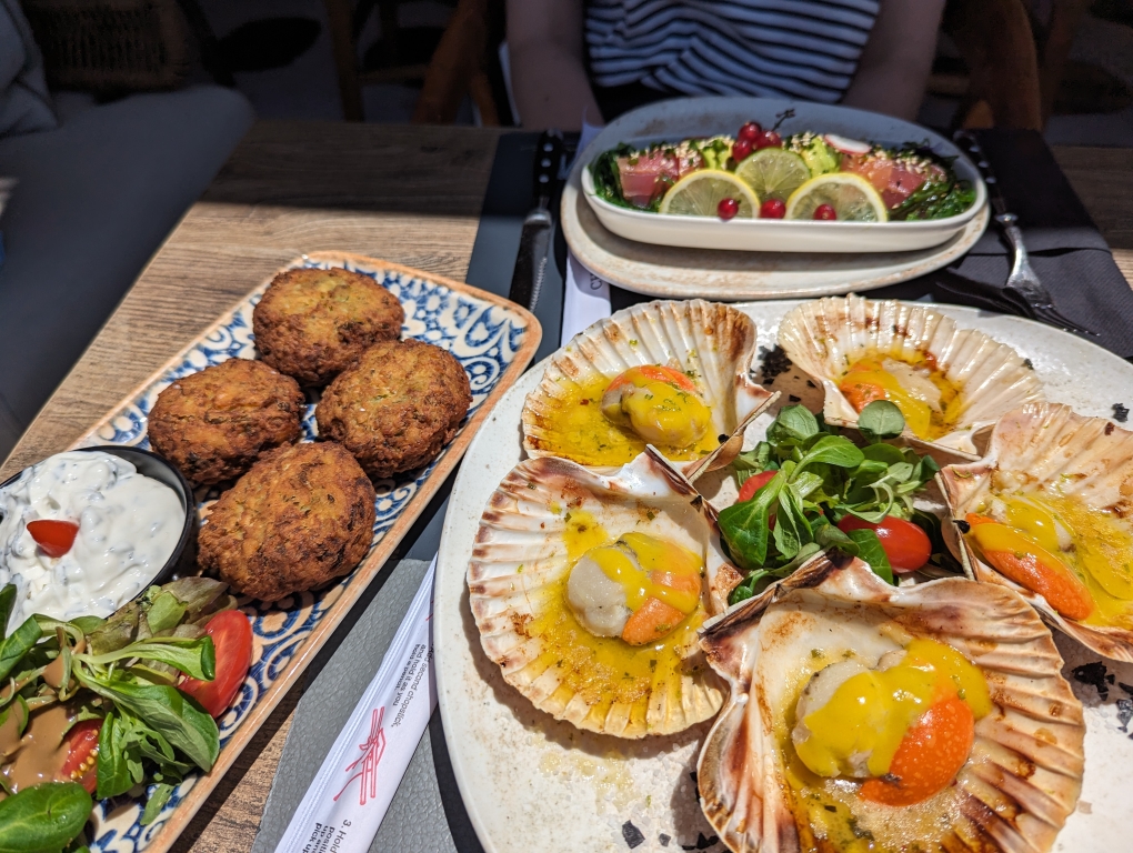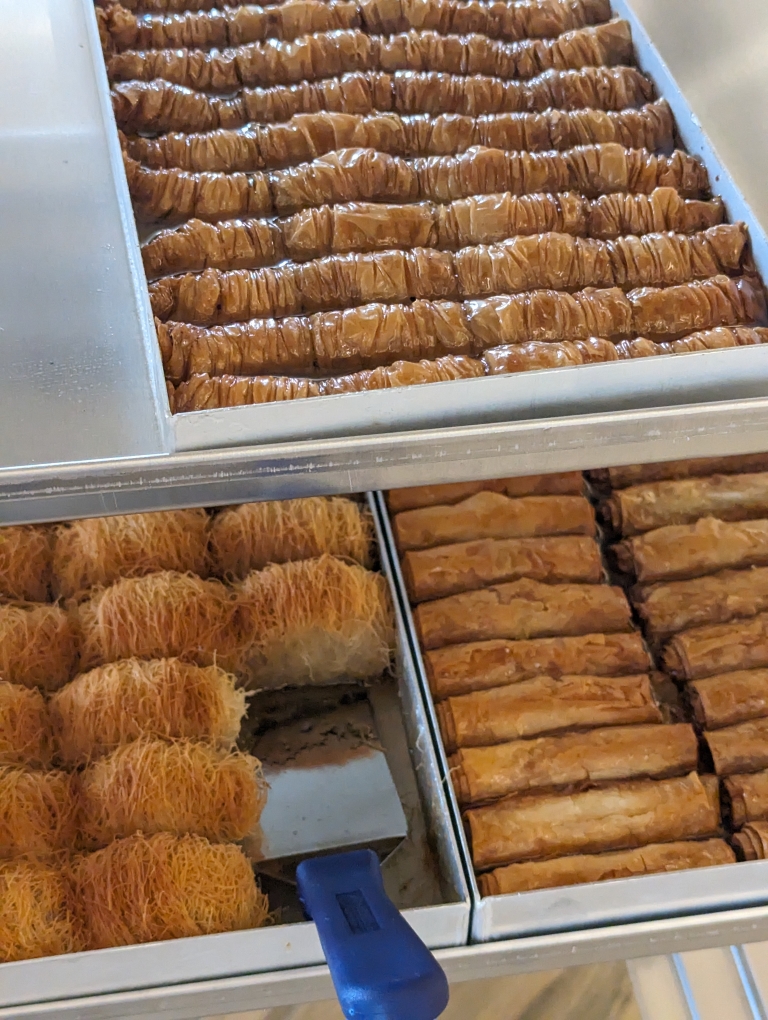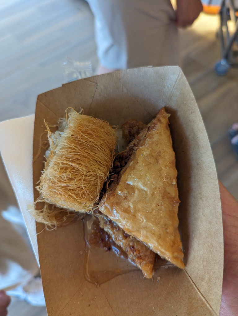 While down in port, we did run into my folks who had the same idea and we shared some greek dessert – baklava and kataifi (shredded phyllo dough).