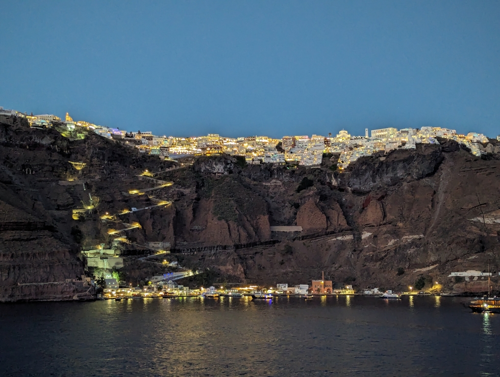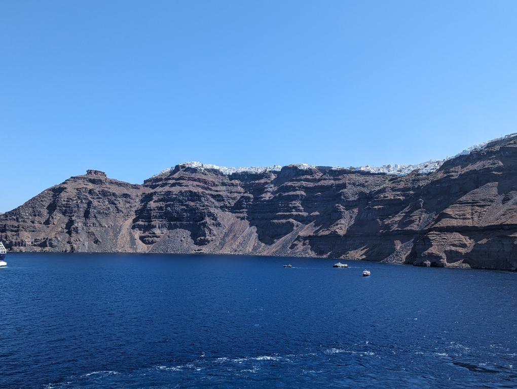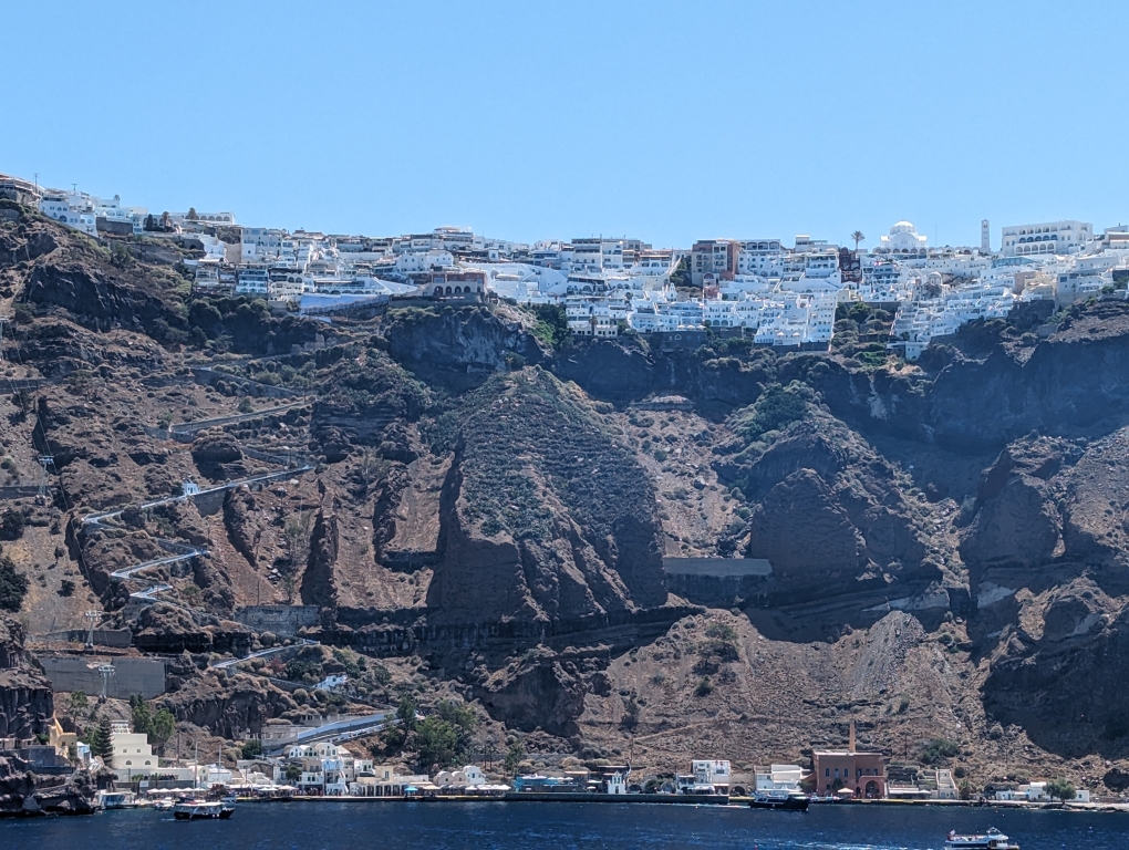 The following day we stopped on the island of Santorini. This is what you picture when you think about the Greek isles and what you see depicted in TV shows and movies. The island is created from volcanic activity and is very rocky. To get up to the town you have three options: cable car, walk, or ride a donkey. While riding a donkey may seem fun and great for getting that insta-picture, my understanding is that the animal welfare of the donkeys is not good. Walking was out of the question for D as it was a steep walk up. The disembarkation and tendering process on this cruise was a little different than others. You had to sign up earlier (up to a few days before) on their online system and then you were given a tender group #. Only when your group was called were you allowed to go down. We didn’t know this until the day before so our tender group was later in the morning. By the time we arrived onshore, there was quite a queue for the cable cars. We ended up standing in the sun/heat for about an hour before getting on the cable car to take up to the town of Fira.