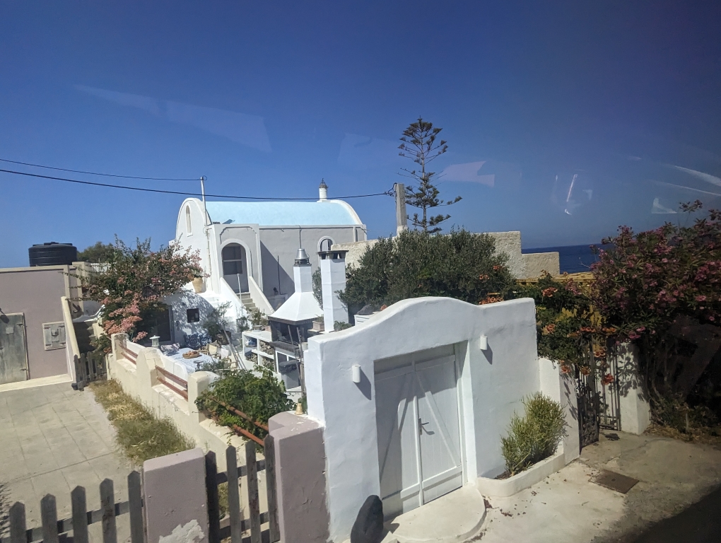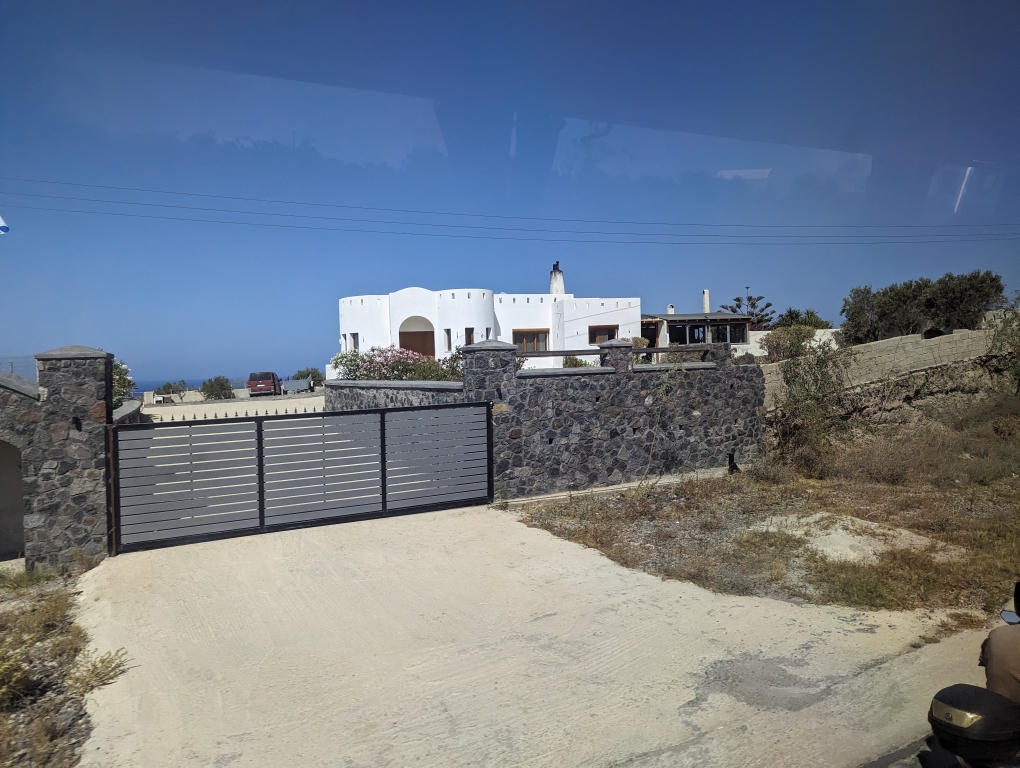 The classic white walled buildings with blue roofs are located in a cliff town called Oia. There are public buses that weren’t too expensive that you can take there, about a 30 minute ride. We found the bus stop and drove across the island. The road took us to the opposite side of the island where it was less cliff-like and actually had more sea access. There were houses scattered throughout but nothing quite condensed like in the various towns of the island.