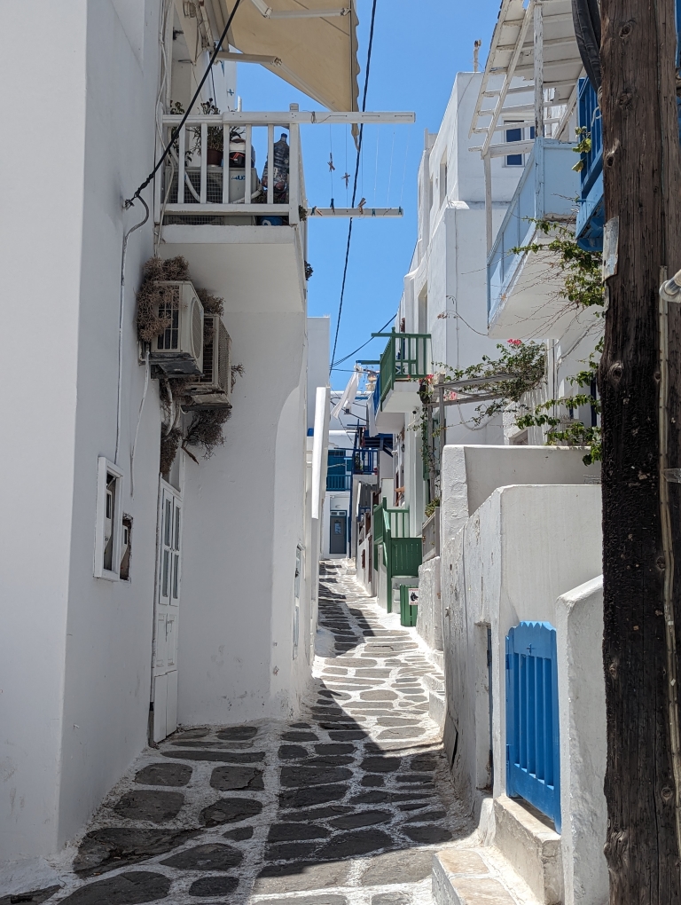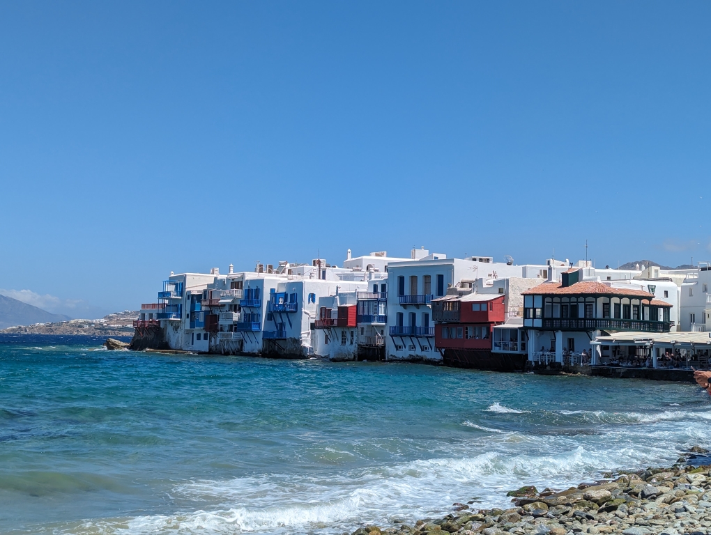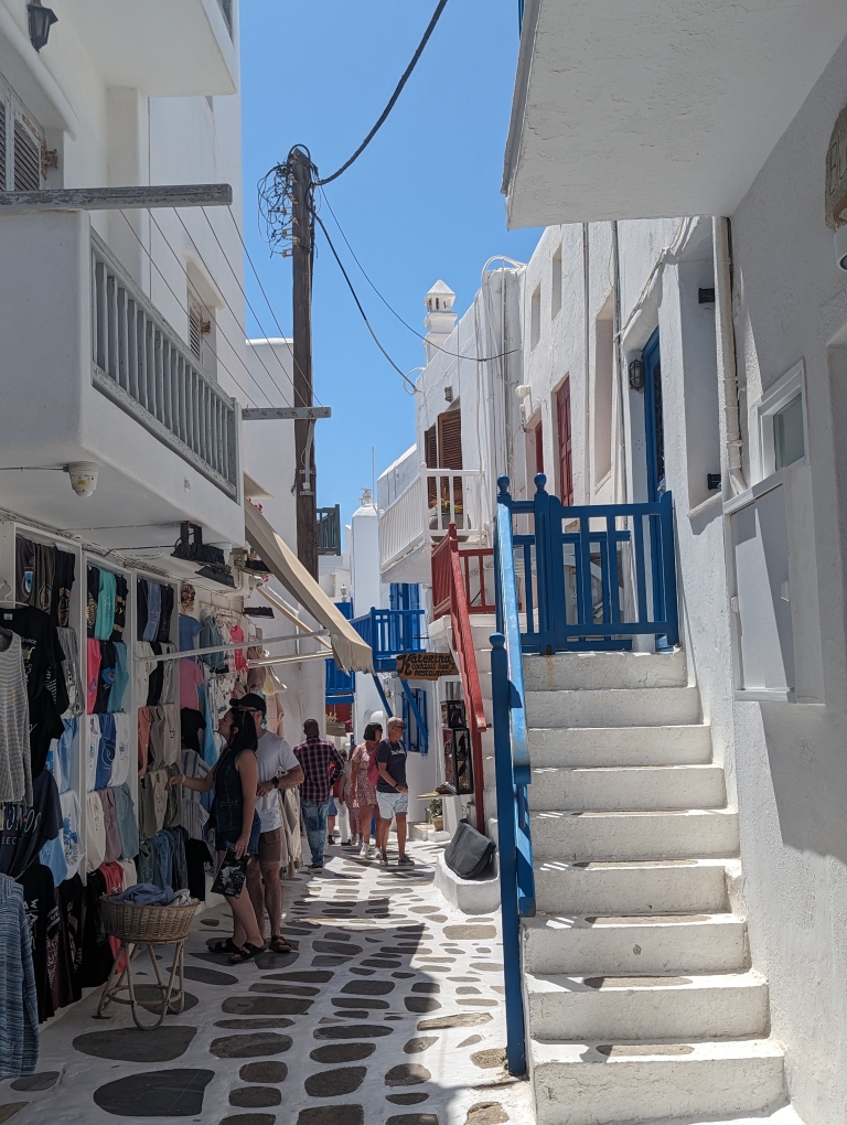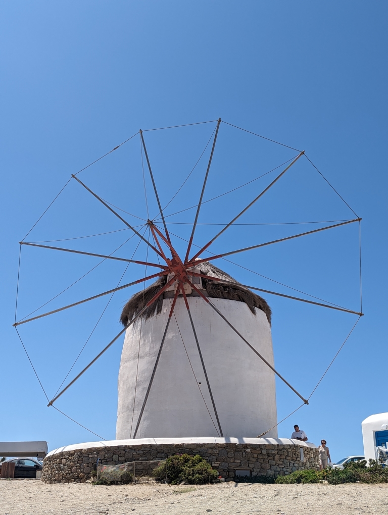 Our last port stop before ending in Athens was on the island of Mykonos. This island is known as a party island and I think A LOT more happens in the evenings and late into the night/early mornings. We did not have any grand plans but wanted to go into town and walk around. The island is best known for their windmills (Kato Mili) and an area called Little Venice (Alefkandra). While the temperatures were still in the 80s, this seaside town had a nice breeze so it was more comfortable walking around. It was nice because we tagged along with my sister and her family doing a walking tour of the village. We also stopped for a nice lunch by the water. A nice final day before we disembarked the following day in Athens.