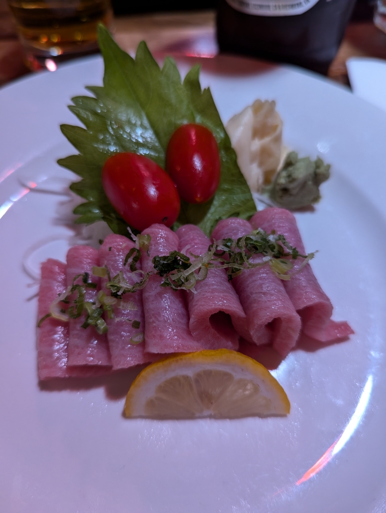 The friends we were meeting had left their 4 young boys with a sitter so I figured we’d pick some cookies up for them as well. Since it was October, they had a seasonal chocolate chip cook with some fall spices. Along with that cookie, we also had the chocolate chocolate chip, regular choco chip, and the oatmeal raisin cookie. They were all very good. We sat in the bakery waiting until meeting up with our friends and then made the short 5 minute walk to the restaurant, Raku it’s Japanese II. Somehow I had thought this was part of Raku Udon but apparently they are unrelated. Luckily it still had good ratings and overall dinner and company were good. I forgot to take pictures but D and I had different types of Udon, also shared some brussel sprouts, a mushroom dish (was very tasty), and some Toro Sashimi (pictured)