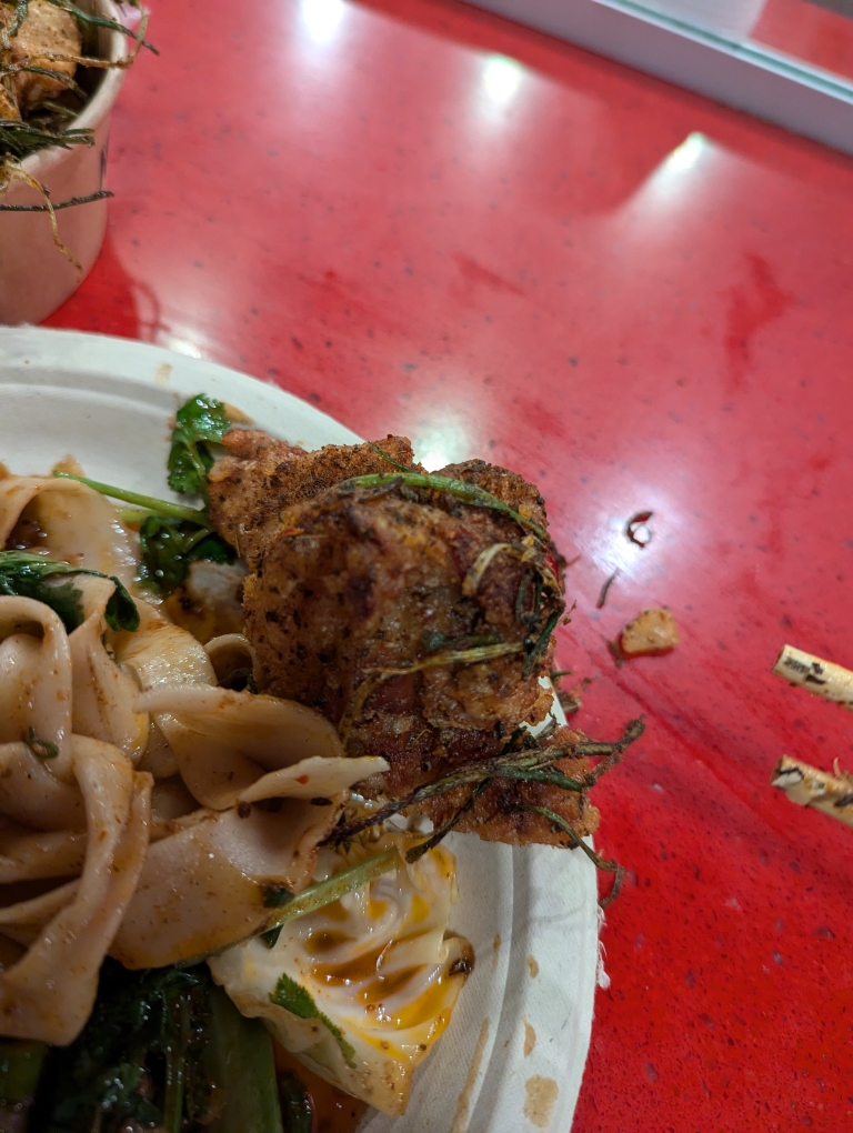 It was definitely an eye catching sight and there were many people out enjoying them before they left, including many kids who were in awe and would run and hug them (I also saw adults hugging them). We had previously gone to Chelsea Market and decided to go check it out again (they also have free restrooms). It was around lunch time so we also picked up some food at Very Fresh Noodles. D had read about this made from scratch hand pulled Chinese noodles. We tried the Tingly & Spicy Cumin Lamb (dry version instead of in soup) and also the Chicken Wings. The wings were nice and crispy and covered in lots of aromatics. The noodles had a nice texture and the cumin lamb they were tossed with gave it a nice flavor. Not too spicy either.