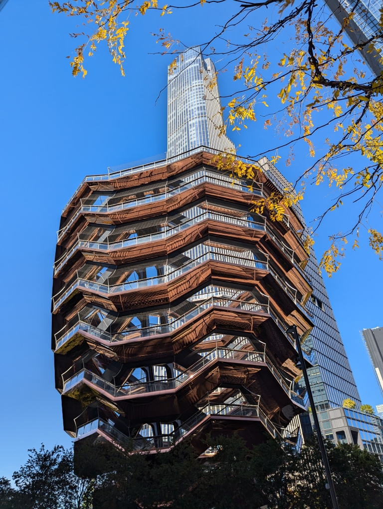Eventually we made it to Hudson Yards (prior to arriving there we had a decent view of The Edge. We left the Highline at this point and walked by The Vessel. It was still closed – apparently too many people had jumped off of it and they were retrofitting it with nets to prevent people from doing this (it opened the following day).
