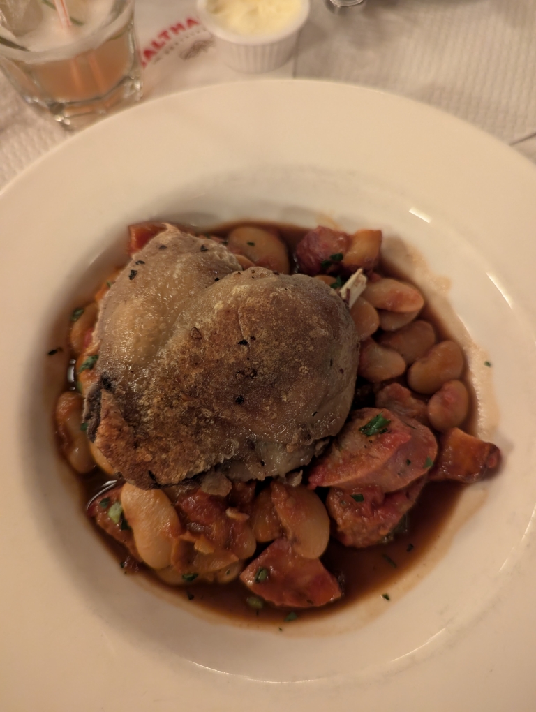 Balthazar was hopping for a Sunday night. We were seated in a back corner, which while out of the way I was kind of glad for because the central area of the restaurant was quite loud with patrons and bustling staff. We each ordered a cocktail and then I had a half dozen Island Creek oysters. D ended up getting the Steak Au Poivre and I had the Duck Cassoulet.