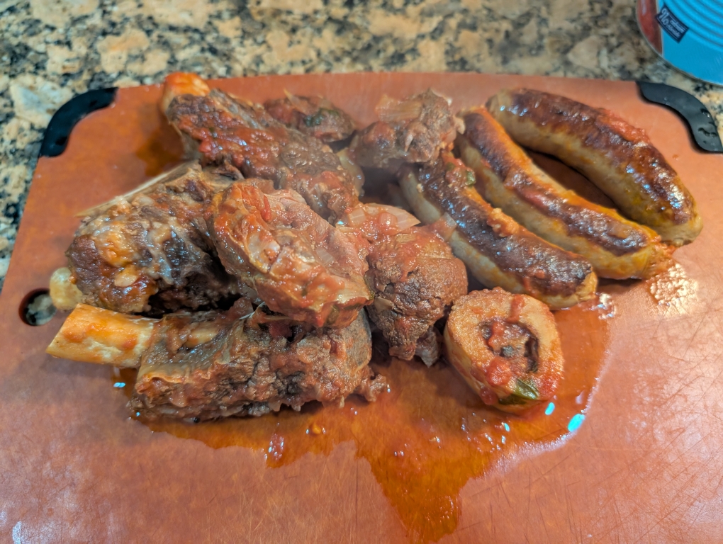 Many years ago now on an episode of No Reservations, Anthony Bourdain was in Italy visiting and ended up having Sunday dinner at one of their local minder’s (or cameraman) grandma’s house. Very commonly they make a Sunday gravy or Ragu that is cooked all day. At the end of it, you have a wonderfully deep ragu sauce along with a plate of meat (that is used to flavor the sauce as it cooks). From what I remember, you have the ragu sauce on some pasta and then can eat the meat separately. There isn’t a specific recipe and many people have basically just put together the ingredients by watching the episode closely. I think I first made this dish back in 2011 for D’s birthday. Since then I probably try to make it at least once a year.