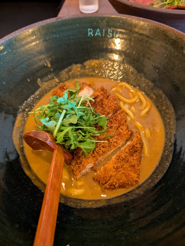 Across from the gallery is the CF Pacific Centre shopping mall, which houses many high end fashion house stores and other ones. We walked through and browsed at a few things as well. As we left, I was getting tired after walking all morning and covering many miles (I believe we walked anywhere from like 6-10 miles while in Vancouver). It was already early afternoon and we ended up driving over to Raisu for a little bit of a later lunch. This place actually had a fairly extensive menu that I would have liked to explore more but we both settled on some udon dishes (Kobe Shabu Shabu Udon for her and Pork Cutlet Currey Udon for me).