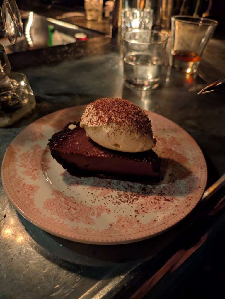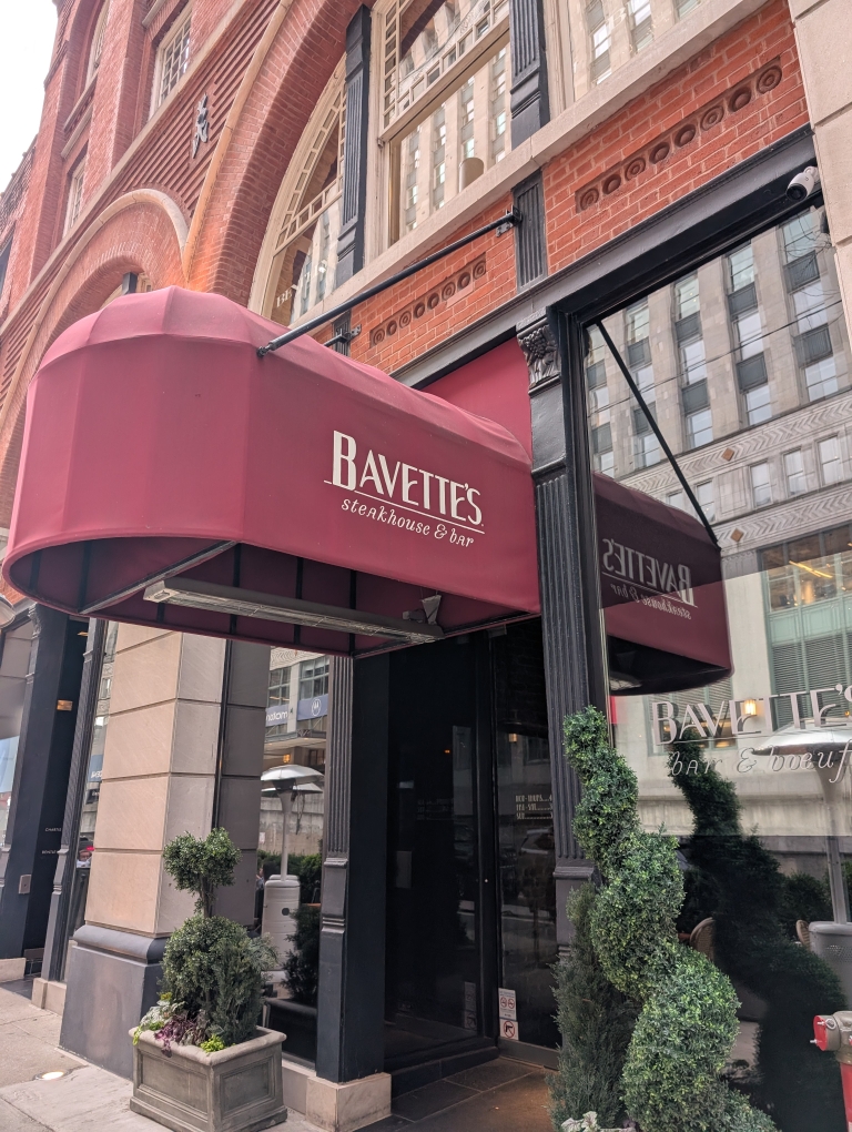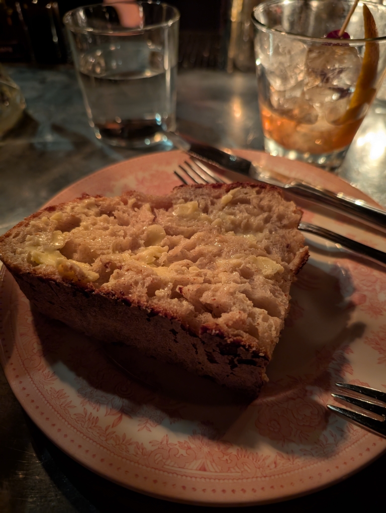 Chicago is definitely an eater’s town and we had planned much of our meals prior to arriving. We didn’t plan far enough ahead to get reservations at a steakhouse that we wanted to try, Bavette’s. Given Chicago’s history as the center of the country’s meatpacking industry we knew we had to get steaks at least once. D had read that you could possibly get a walk-in table at Bavette’s, especially on a Tuesday night. After dropping off our luggage we walked over to Bavette’s. We put our names on the wait list but eventually found a spot at their downstairs bar (which also serves a full dinner menu). I started with a couple of fresh oysters and we shared the mixed greens and apple salad. They’re also known for their hand-made sourdough bread so we got some of that. I will say that the bread and butter was a highlight of the meal. For our main, we shared the Dry-Aged Bone-in ribeye (20 oz 42 day dry aged) along with a side of broiled asparagus. For drinks I had a Rittenhouse Rye Old Fashioned and a Cognac Sazerac. Both very good.