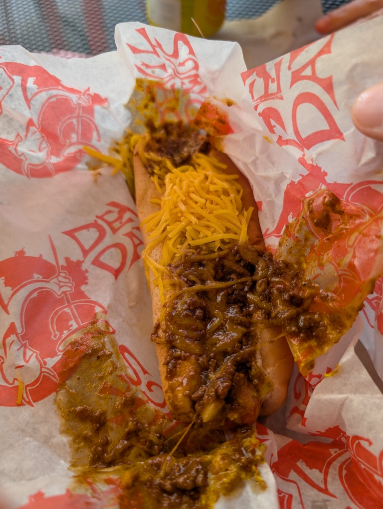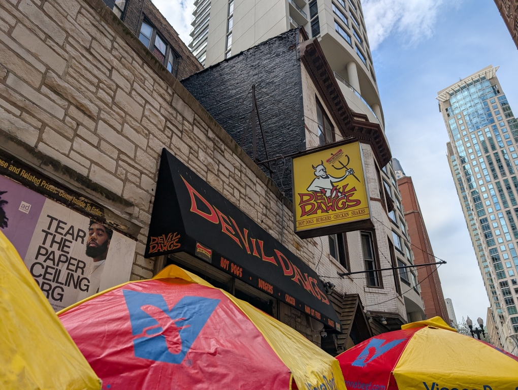 On our way out through the southern part of campus, we walked by some of my old dorms (PARC, Allison Hall, and Shepard Hall). We continued into Evanston and passed Buffalo Joe’s (a favorite of my cousin) and back to the L. It was getting late for lunch but we stopped at Devil Dawgs, right by the John Hancock Tower/Chicago Water Tower for a Chicago Hot Dog and a Coney Dog.