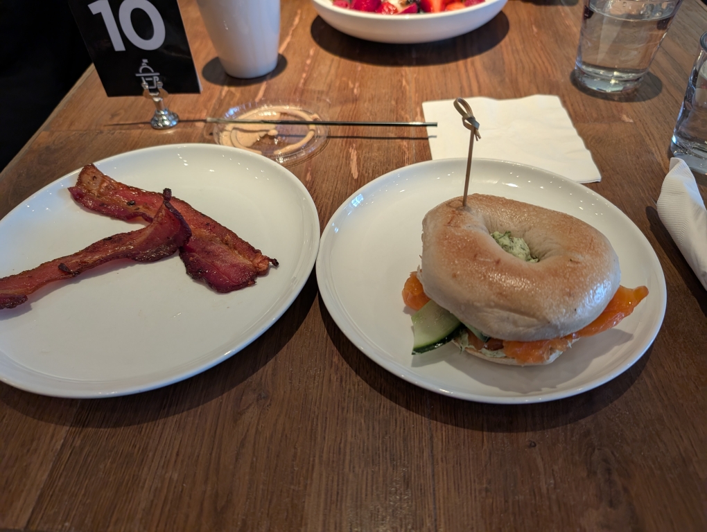 Our last full day in Chicago we didn’t really have any set plans except for lunch and dinner. D had found a cute breakfast spot over near Navy Pier and so we walked over to Cupitol Coffee and Eatery. I got excited when I saw they had Freddo espresso on their menu. This brought back memories of our trip to Greece last year (here). For food I had the Gravlax bagel (house cured salmon, herb cream cheese, cucumber on a plain bagel). I also had a side of the Jones Bacon.