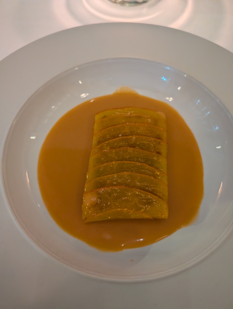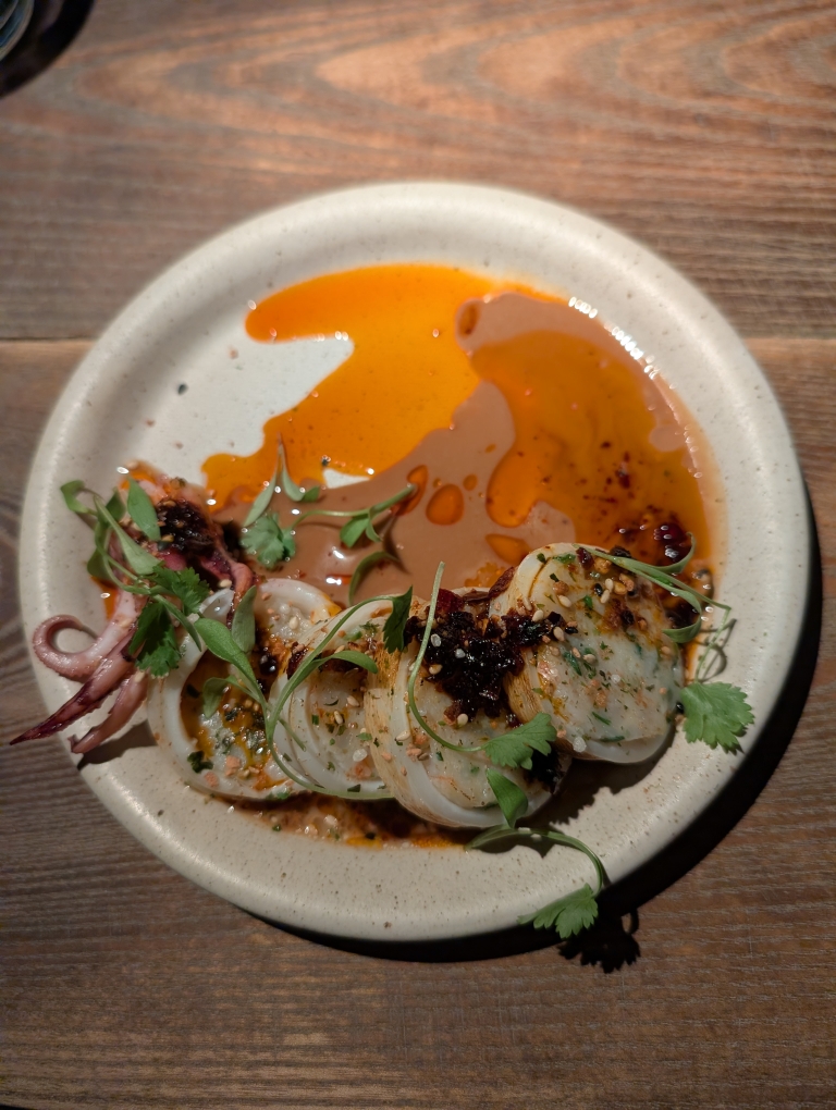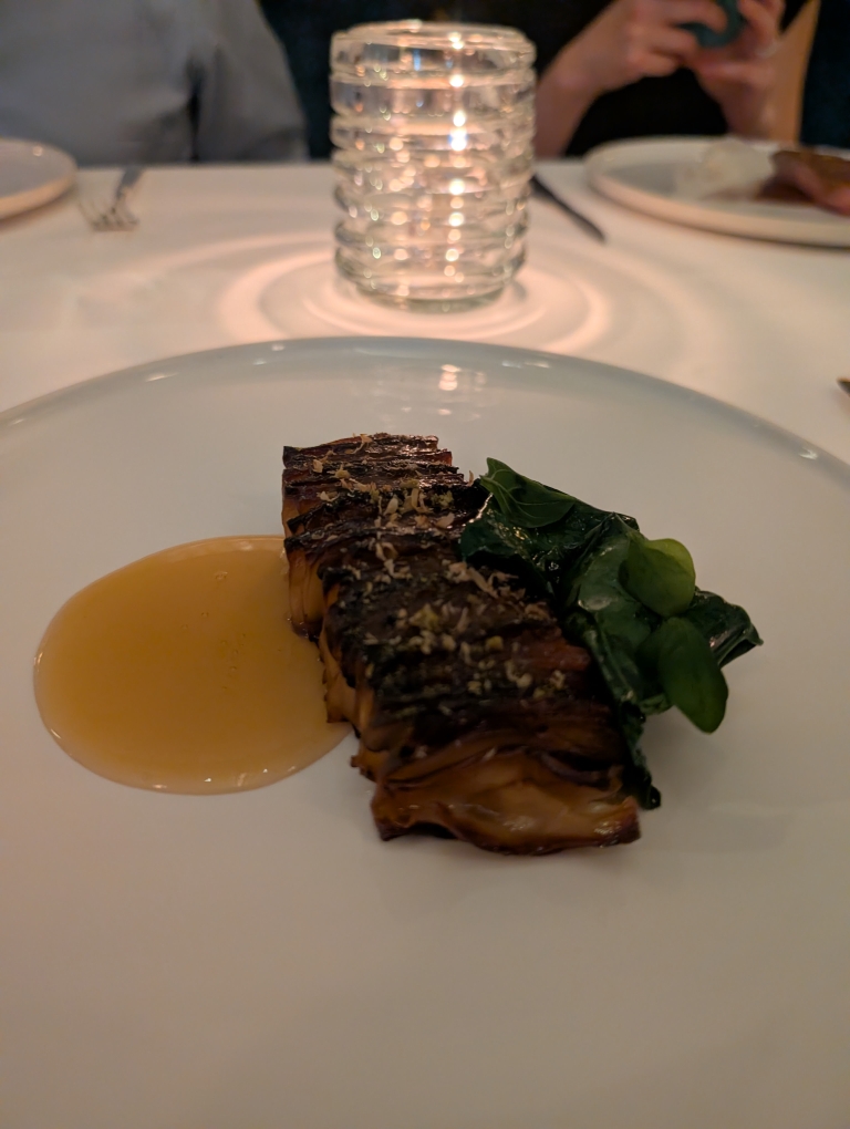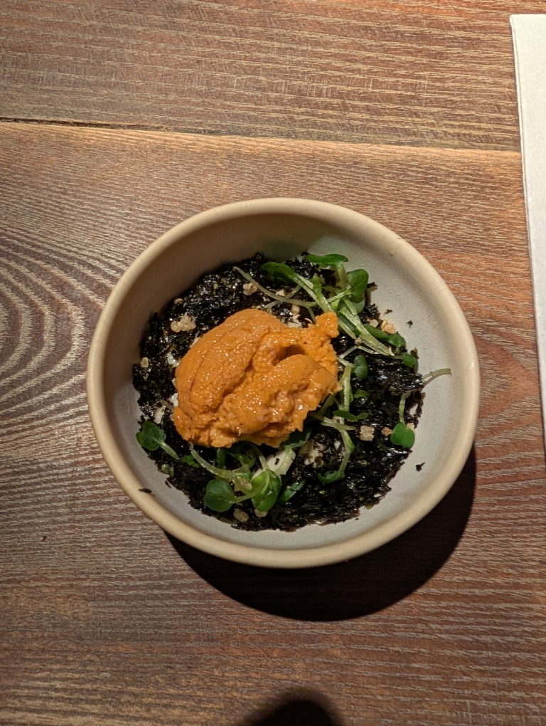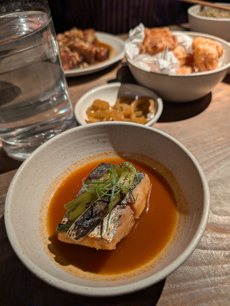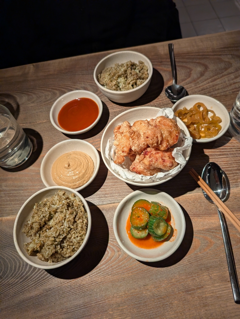 It was a set course menu where you could choose from the various sections. We had the sea urchin starter, then the blue fin tuna. D had the squash while I chose the squid and then for the mains we had Spansih mackerel, Pork Galbi, and their famous Korean fried chicken. I realized that I am more of a fan of US southern fried chicken than the type of coating they used.