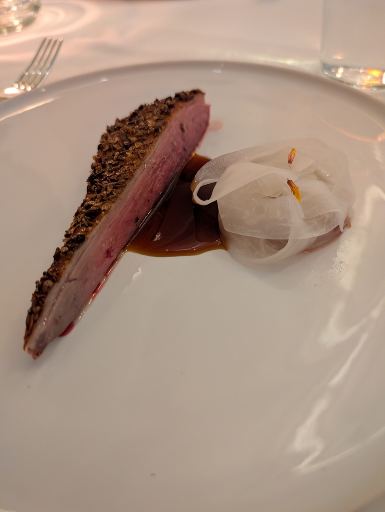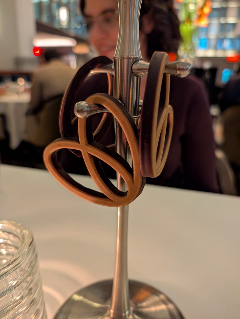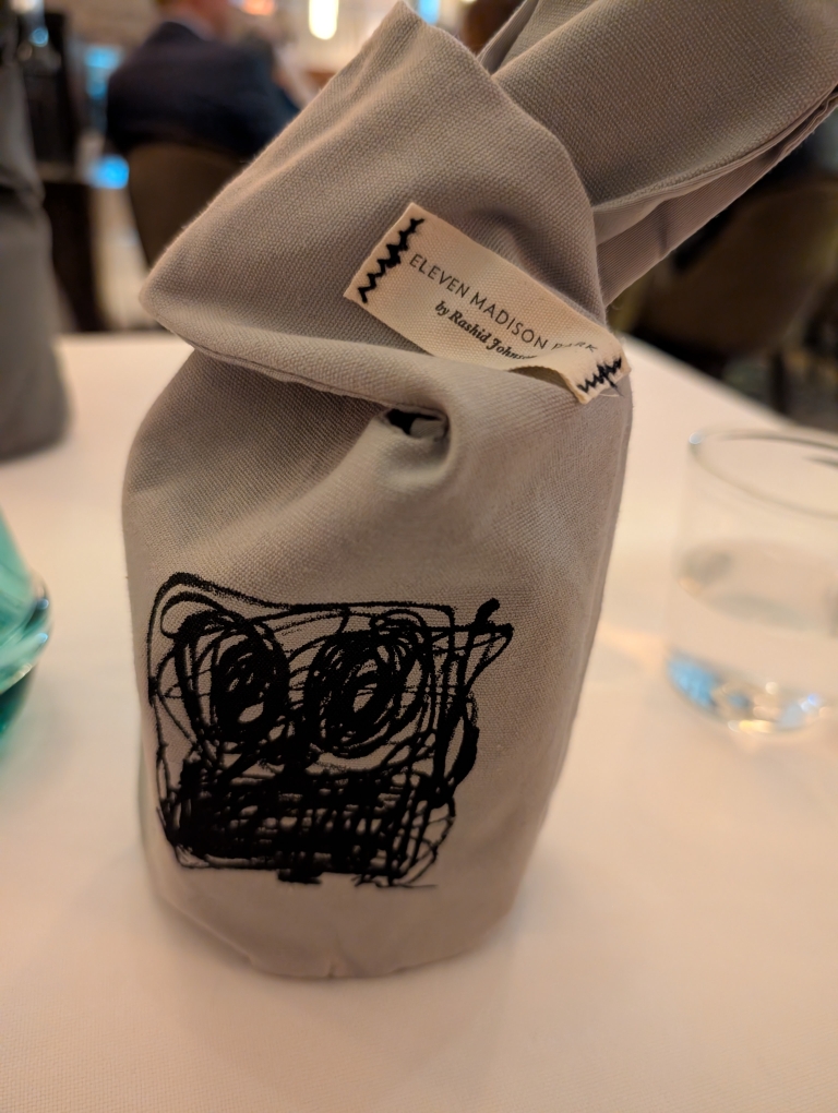Finally we met up with my cousin for our annual fancy dinner. This year we had reservations at Eleven Madison Park. It was neat because after being vegan for the past several years they actually were starting to introduce some meat back into their menu (still focusing heavily on plant based foods). D stuck with their all vegetarian menu and my cousin and I partook in their “meat” offerings (duck, seafood). The opening dish with a laminated bread with onions (of varying kinds) and an onion butter was a great starter. The other standout for me was the Hasselback potato dish – using a tree seed to create a “caviar” and also plant based “sour cream.” The pretzel at the end with their vermouth was also wonderful. Going back to our time at Guggenheim, we found out the artist that was on exhibition there is great friends with chef at Eleven Madison Park (he was best man at the chef’s wedding) and he had his art in the lounge area along with designing the cooking vessel the Hasselback potatoes came in. So it was a fun coincidence.