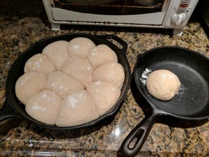 I then divided the dough into 16 pieces. Each piece was then individually rolled into more or less a ball like shape and placed in some cast iron pans.